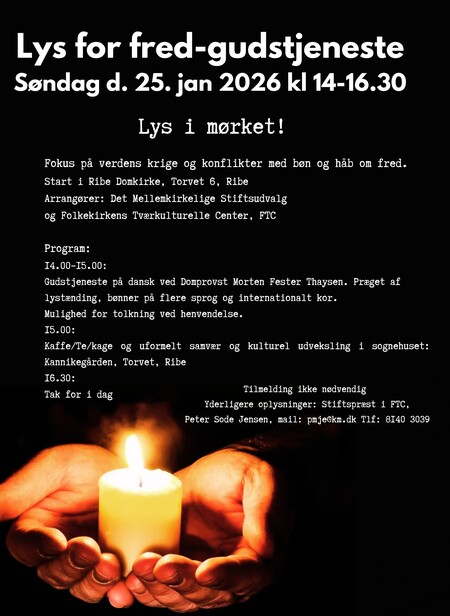Lys for Fred-gudstjenesten sætter fokus på verdens krige og konflikter og samler mennesker i bøn og håb om fred. I Ribe Domkirke tændes lys i mørket, når ord, musik og bønner på flere sprog mødes i et fælles ønske om forsoning og fred.